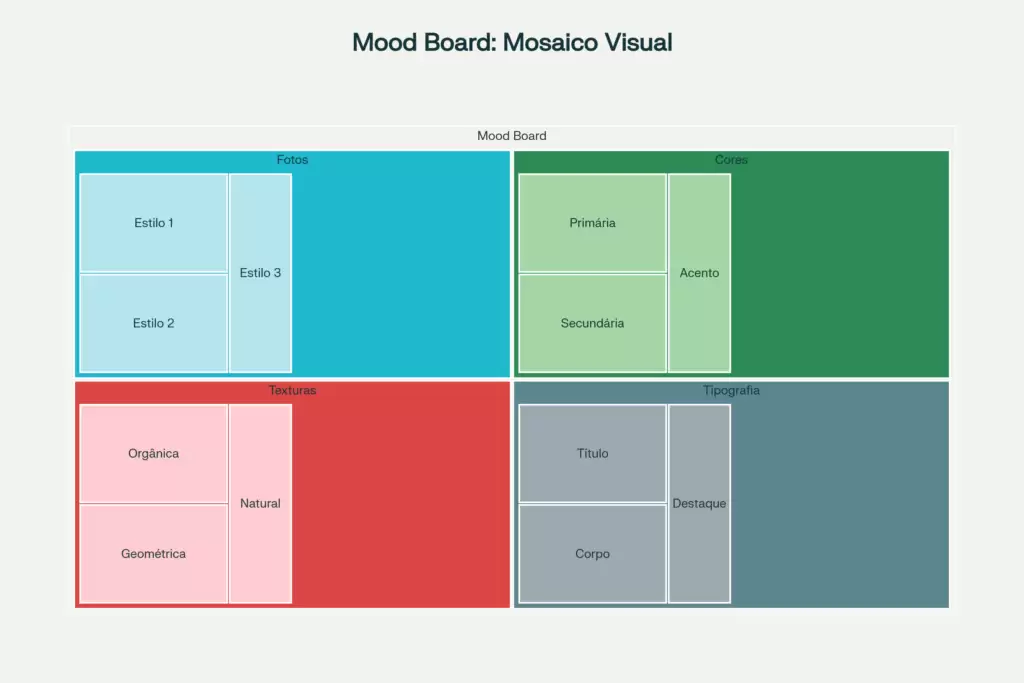 O mood board sintetiza referências que traduzem o posicionamento. Ele orienta tom, cor, textura e direção estética e garante que todos os envolvidos tenham uma visão comum antes da execução.